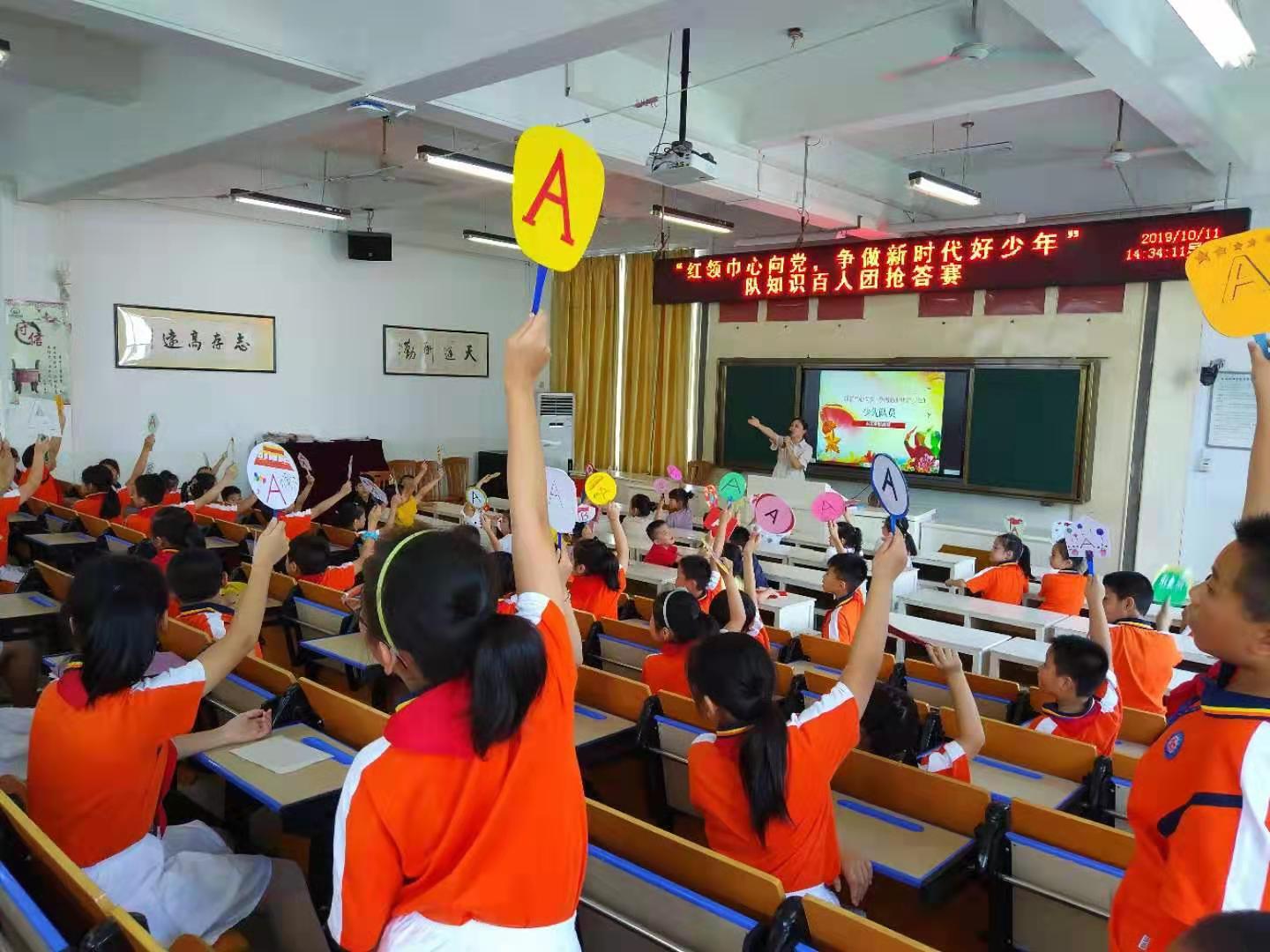 閩清縣實驗小學(xué)各中隊輔導(dǎo)員組織班會課,開展主題為“紅領(lǐng)巾心向黨,爭做新時代好少年”的少先隊知識挑戰(zhàn)賽。選手們自制美觀、特色的AB板,踴躍回答問題,似乎每道問題都是勢在必得,場面十分激烈。參與百人團(tuán)挑戰(zhàn)賽的五(1)班王同學(xué)說道:“我覺得這次開展的活動很有意義,不僅讓我們學(xué)到了少先隊的知識,還感受到了身為一名少先隊員的自豪感?!?/p>