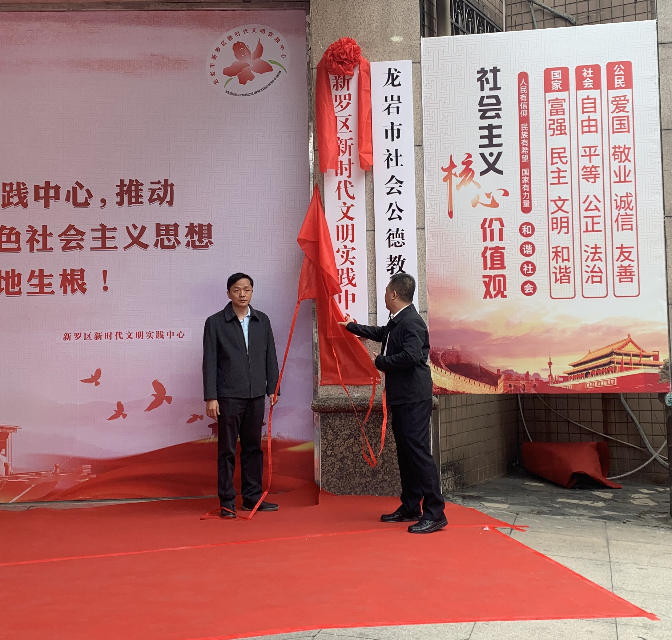 新羅區(qū)委副書記、代區(qū)長張鋒,新羅區(qū)委副書記鄭金國為新羅區(qū)新時代文明實踐中心揭牌 新羅區(qū)委文明辦供圖