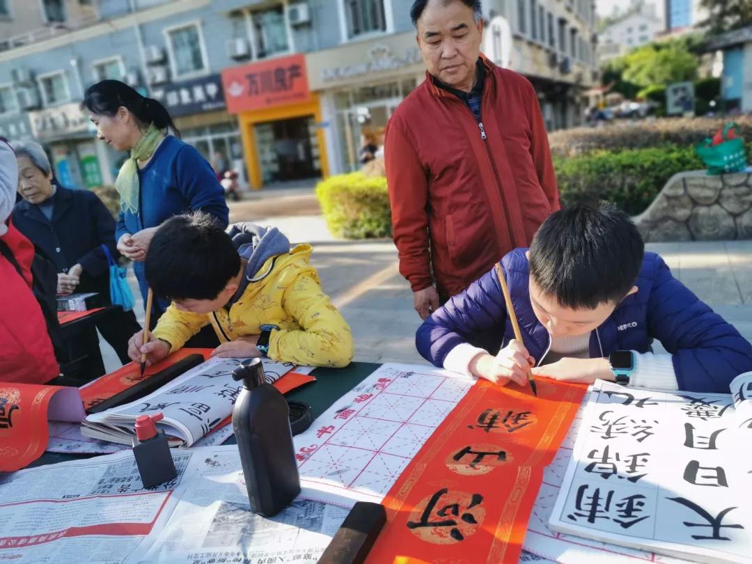 更難得的是縣實(shí)驗(yàn)小學(xué)的徐鳳華老師,帶領(lǐng)我校三元書畫社的小小書法家們忙著選聯(lián)句,飽蘸濃墨,潤(rùn)圓筆鋒,提筆揮毫。他們的現(xiàn)場(chǎng)作品也讓前來挑選春聯(lián)的居民們大開眼界、愛不釋手,孩子們美好的祝福給這年關(guān)將近時(shí)節(jié)帶來無限的春意和暖意。當(dāng)百余副充滿吉祥、祝福的春聯(lián)、福字拿在居民手上之時(shí),大家表示,這樣的送春聯(lián)送祝?;顒?dòng)具有特殊意義。