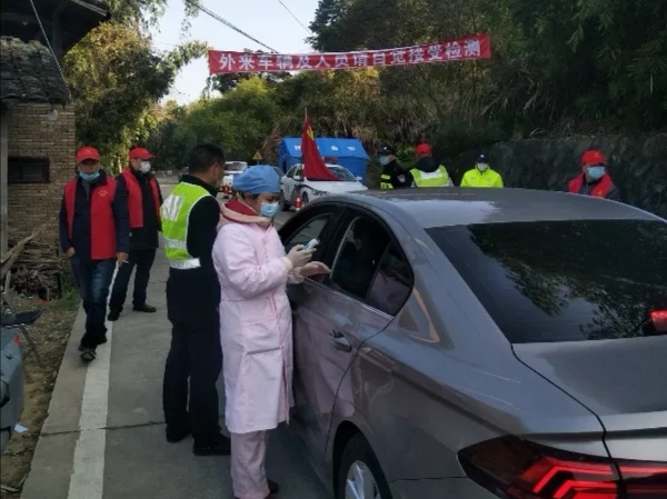 自然資源與規(guī)劃局志愿者聯(lián)合醫(yī)務(wù)工作人員對(duì)過往車輛進(jìn)行體溫檢測(cè) 永泰縣文明辦供圖