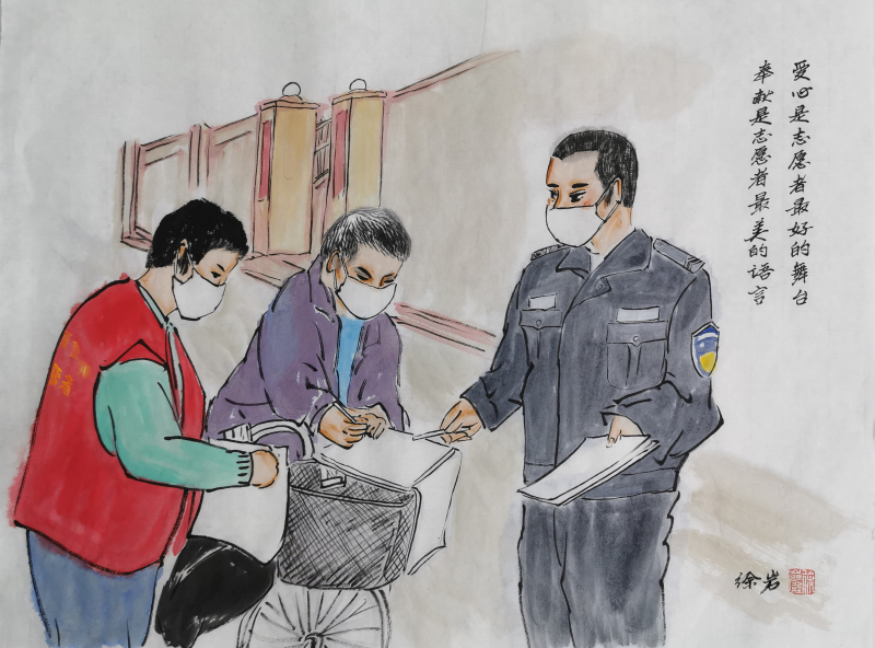 中國鄉(xiāng)土藝術(shù)協(xié)會(huì)傳統(tǒng)文化委員會(huì)主任徐巖先生是支部宣委林淑珍的老師,當(dāng)?shù)弥獙W(xué)生正做為黨員志愿者奮戰(zhàn)在疫情防控一線,徐巖先生有感而發(fā),為田中志愿者欣然揮毫,描繪下他們?nèi)粘Cβ档纳碛?,助力疫情防控宣傳?/p>