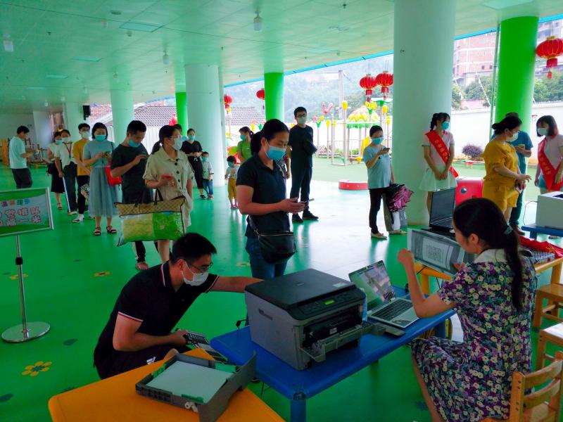 “家長你好,請把孩子的用品放到這里,另外請把孩子的健康碼打開,有序排隊打印,請不要扎堆聚集,注意安全。”縣氣象局的志愿者們就做好維持秩序、協(xié)助打印積極開展志愿服務(wù)。