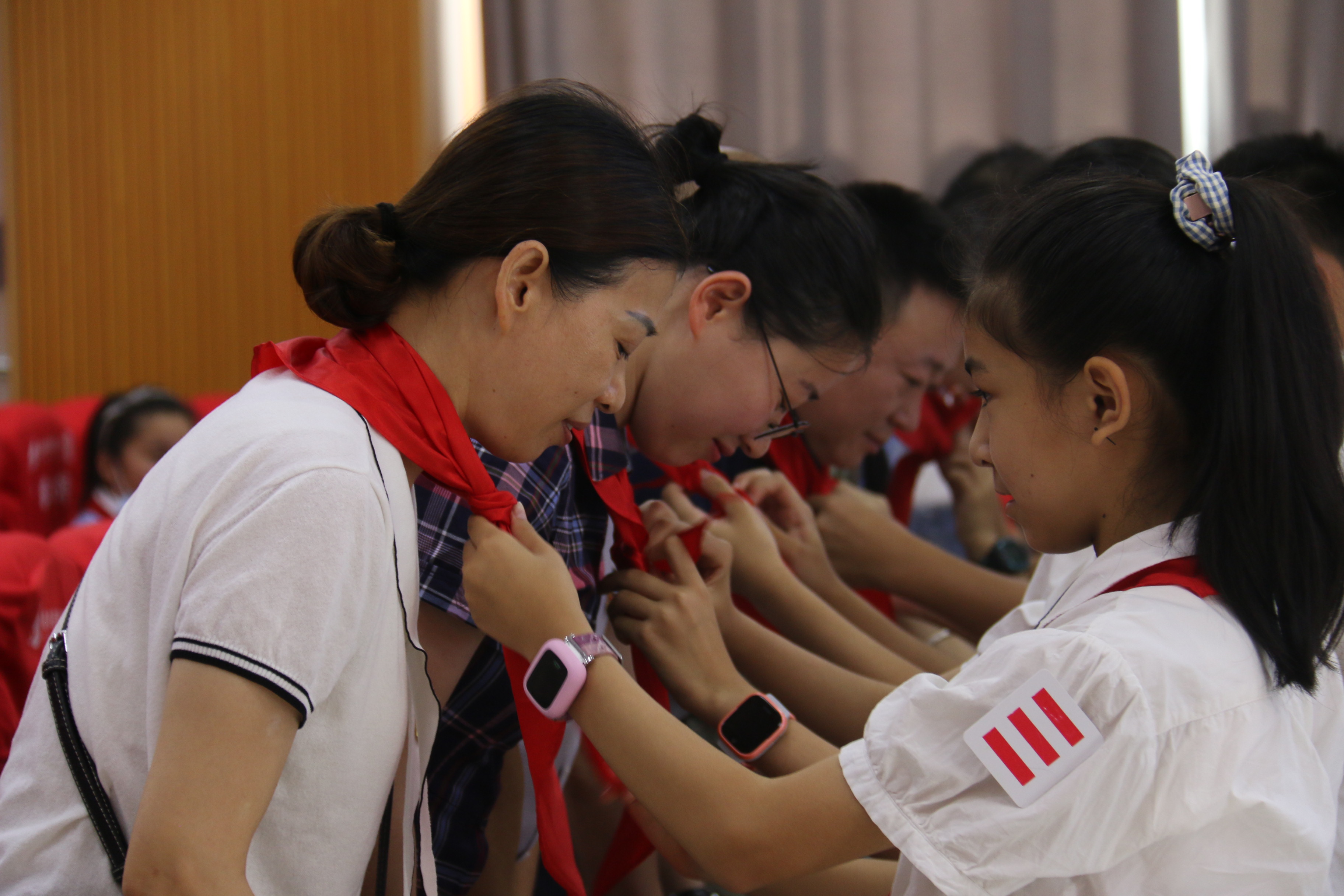 分享會上孩子們?yōu)閰钨e敬獻紅領巾