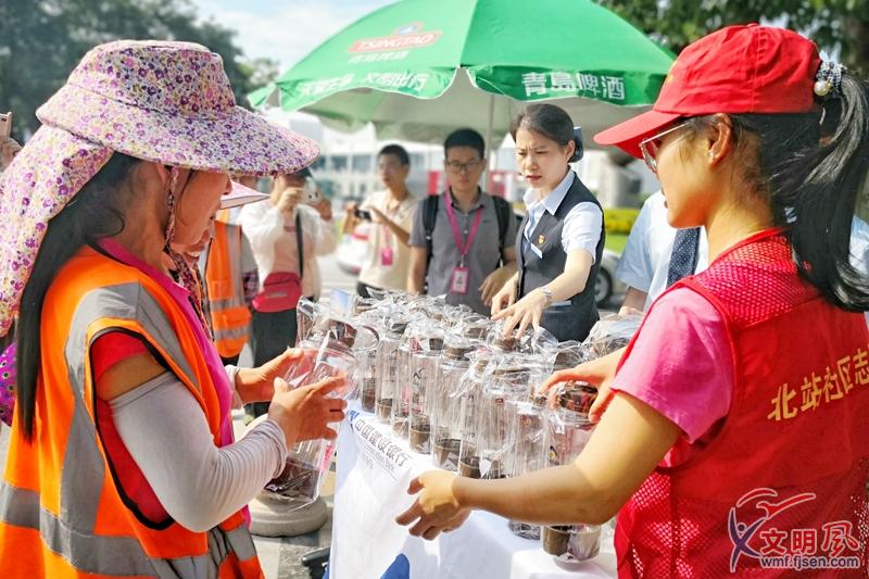 湖里區(qū)殿前街道北站社區(qū)企航志愿服務(wù)聯(lián)盟成員單位建行航空港支行開(kāi)展“勞動(dòng)者港灣”服務(wù),為社區(qū)老人提供愛(ài)心水杯(殿前街道供稿)