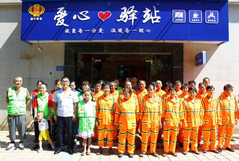 在愛心驛站前和富山社區(qū)環(huán)衛(wèi)工人合影 漳平市委文明辦供圖