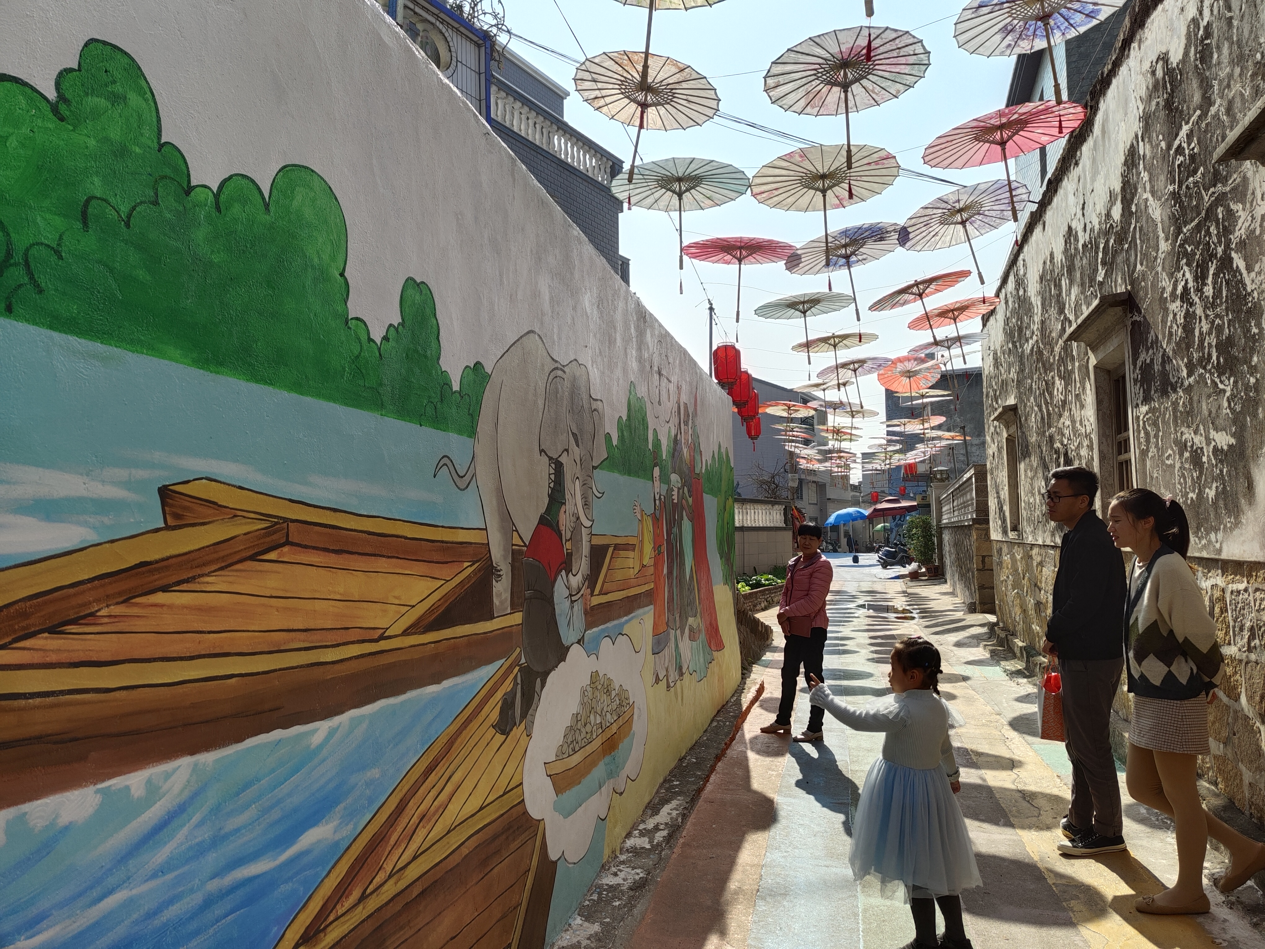據(jù)了解,該組壁畫(huà)共分為鄉(xiāng)愁文化、經(jīng)典文學(xué)、社會(huì)主義核心價(jià)值觀等不同主題,歷時(shí)近兩個(gè)月完成創(chuàng)作。其中,有人們頗為熟悉90年代小學(xué)語(yǔ)文教科書(shū)插圖,讓大家重溫經(jīng)典,回憶舊時(shí)光。同時(shí),創(chuàng)作者還充分結(jié)合了當(dāng)?shù)氐拿袼缀退囆g(shù)文化,通過(guò)“墻體文化”的方式呈現(xiàn)出戲曲表演、賽龍舟、童年游戲,以及農(nóng)忙時(shí)節(jié)勞動(dòng)的場(chǎng)景,富有濃厚的生活氣息。