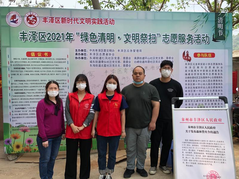 文明風(fēng)4月8日訊 清明節(jié)期間,豐澤區(qū)委文明辦、豐澤區(qū)應(yīng)急局和豐澤區(qū)志愿者協(xié)會在東湖街道齊云路口鐵路橋下、清源山正山門口左側(cè)、城東街道桃花山公園北大門邊、北峰街道肖厝社區(qū)高速收費站下進山路口、東海街道北星社區(qū)觀音山路口等5個上山掃墓人群比較集中的路口設(shè)立志愿服務(wù)點,開展2021年“綠色清明 文明祭掃”志愿服務(wù)活動,服務(wù)時間為2021年4月3日-5日。