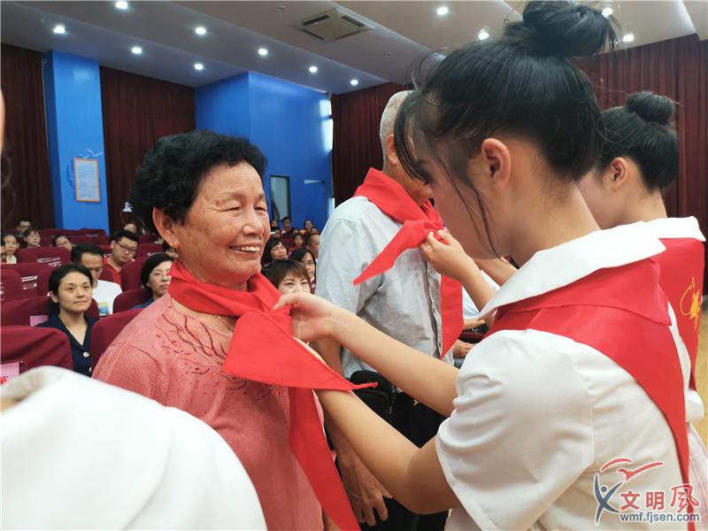 現(xiàn)場(chǎng),華師附小的少先隊(duì)員還為三位光榮在黨50年的老黨員敬獻(xiàn)紅領(lǐng)巾。1966年入黨的青礁村老黨員顏秀卿心情非常激動(dòng),“以前的青礁村很窮,村民只有微薄的工分收入,現(xiàn)在村里有蘆塘?xí)?、幸福食堂,老人還能領(lǐng)社保,從青礁村就可以看出我們的祖國在中國共產(chǎn)黨的正確領(lǐng)導(dǎo)下,不斷發(fā)展富強(qiáng)?!崩宵h員顏秀卿還寄語在場(chǎng)的少先隊(duì)員們,要聽黨話、跟黨走,好好學(xué)習(xí),牢記革命前輩的優(yōu)良傳統(tǒng),學(xué)習(xí)雷鋒好榜樣把有限的生命投入到無限的為人民服務(wù)當(dāng)中。