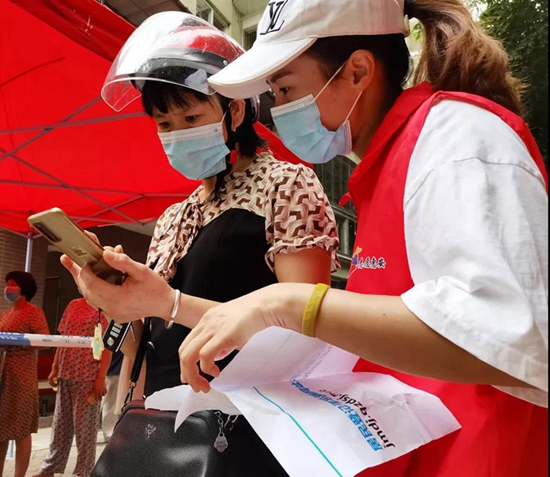 薯花文明志愿服務(wù)總隊志愿者指導(dǎo)群眾進(jìn)行核酸檢測掃碼注冊?;莅参拿鬓k 供圖