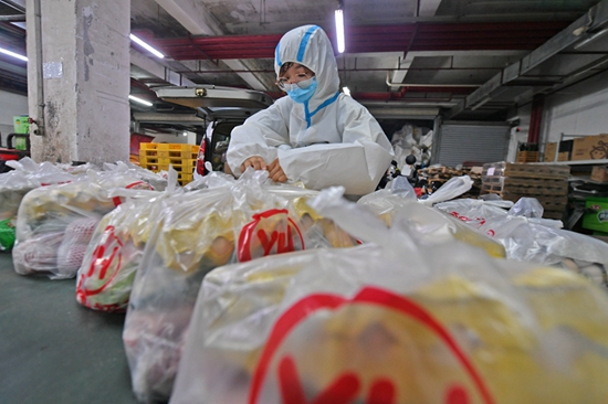 超市志愿者正在打包整理,給泉港區(qū)界山鎮(zhèn)群眾配送生活物資。林弘梫 供圖