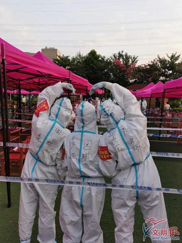 興園社區(qū)的巾幗志愿者在同安,工作間隙為自己加油。(興園社區(qū)供圖)