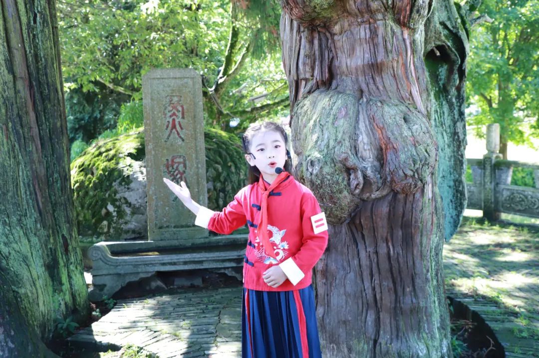 紅領(lǐng)巾導(dǎo)游隊小導(dǎo)游講解魚冢的來歷。周寧縣融媒體中心供圖