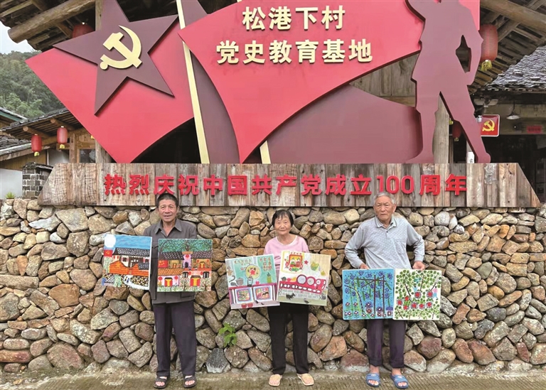 秋日的下村,稻田金黃,山野青翠,村口的老柿樹上掛滿柿子??娫孪稍谧约业乩镎枚棺樱泵s回家,自從今年初村里建了黨史教育基地,她就想畫一幅“紅軍畫”,聽說國慶期間有縣美協(xié)的老師來村里“教”畫畫,她就想快點忙完農(nóng)活,好好地畫一幅。農(nóng)忙之余畫一點畫,讓自己的晚年有了顏色,生活有了起色。在下村,像繆月仙這般愛畫畫的老人還不少。