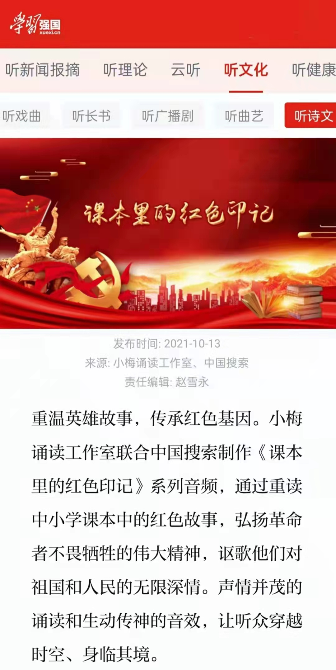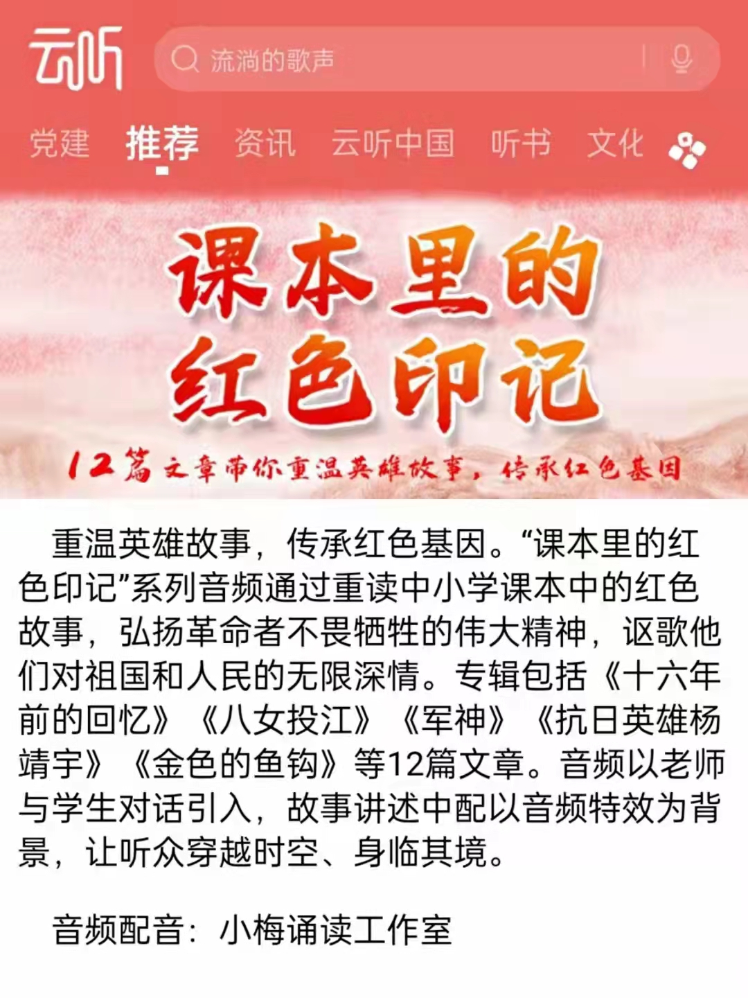 自去年1月份以來,該縣依托五里街中心小學(xué)的“小梅誦讀”公益平臺,發(fā)起“童聲抗疫 與愛同行”音頻作品征集活動,引導(dǎo)孩子們用聲音傳遞真情,用文字記錄美好,以實(shí)際行動支持戰(zhàn)“疫”。該活動開展以來,迅速得到各媒體和廣大師生的熱情支持,多個省的上千名“誦讀達(dá)人”報送了應(yīng)征作品。該平臺先后制作推出“可愛的中國”“逆行之光”等誦讀專輯,累計發(fā)布誦讀作品700多篇新華社客戶端、新華網(wǎng)客戶端、中國文明網(wǎng)、學(xué)習(xí)強(qiáng)國、中央廣播電視總臺云聽、光明日報閱讀公社、福建日報閩南網(wǎng)、泉州文明網(wǎng)以及中國搜索、喜馬拉雅等十多個融媒體平臺同步推送,閱讀量突破2億次。特別是從今年5月起,該團(tuán)隊推出《課本里的紅色印記》專輯,通過誦讀課本里的紅色故事,讓廣大青少年從革命精神中感知責(zé)任使命,在歷史坐標(biāo)中強(qiáng)化時代擔(dān)當(dāng),引發(fā)眾多省內(nèi)外在校生廣泛共鳴,僅活動征集令就達(dá)到154萬的閱讀量?!妒昵暗幕貞洝贰栋伺督贰肚遑殹贰恶R背上的小紅軍》《軍魂》《金色的魚鉤》等一大批紅色經(jīng)典文學(xué)作品透過清亮的童聲得到了更好更廣泛的傳揚(yáng),浸潤了青春。