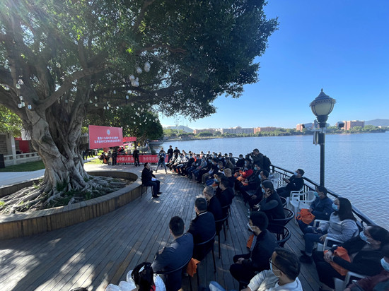 活動現(xiàn)場,有關(guān)單位領(lǐng)導(dǎo)共同為馬甲鎮(zhèn)新時代文明實踐公園揭牌,并在講解員的帶領(lǐng)下共同參觀馬甲鎮(zhèn)新時代文明實踐公園。據(jù)悉,該公園是洛江區(qū)新時代文明實踐“一鎮(zhèn)一園”鄉(xiāng)村小康綜合體建設(shè)工作一個成果,以“七大平臺”整合“洛地有聲”基層宣講等特色品牌,活動現(xiàn)場為群眾提供音樂展演、繪畫展覽、南音同唱等沉浸式的文藝服務(wù),在湖光山色中引領(lǐng)群眾走進初心島,共同聆聽黨的十九屆六中全會精神宣講。