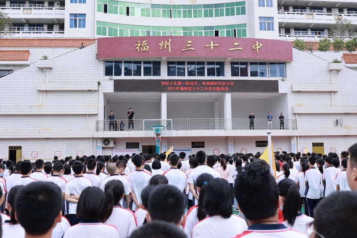 福州第三十二中學(xué)國(guó)旗下講話宣講“新時(shí)代好少年”事跡。晉安區(qū)委文明辦供圖