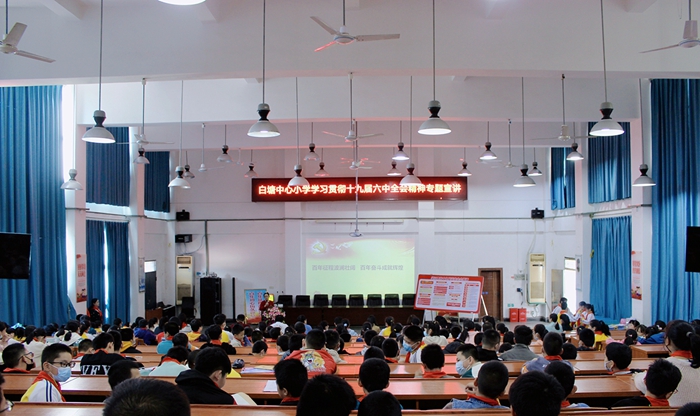 “沒有共產(chǎn)黨就沒有新中國……”白塘中心小學(xué)同學(xué)們嘹亮的歌聲在該校報(bào)告廳內(nèi)響起。日前,為宣傳貫徹黨的十九屆六中全會(huì)精神,該校舉行了主題為“黨員隊(duì)員學(xué)全會(huì) 以史為鑒啟新程”的紅領(lǐng)巾講壇活動(dòng),活動(dòng)采取看視頻、知全會(huì)、宣精神、談感悟、送寄語、唱歌曲等一系列寓教于樂的活動(dòng),讓愛國主義種子在孩子心中生根發(fā)芽。
