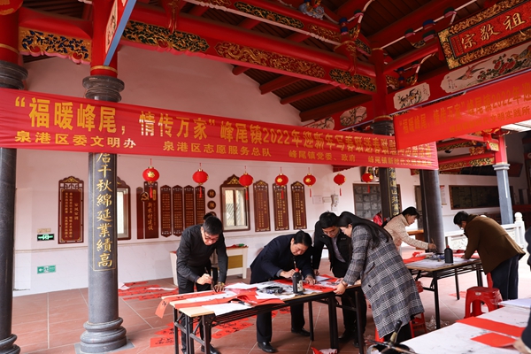 文明風(fēng)1月21日訊(通訊員高靜 陳燕燕)為傳播中華民族優(yōu)秀傳統(tǒng)文化,豐富廣大人民群眾精神文化生活,營(yíng)造歡樂(lè)喜慶、文明祥和的節(jié)日氛圍,1月18日,泉港區(qū)峰尾鎮(zhèn)新時(shí)代文明實(shí)踐所組織文化服務(wù)志愿服務(wù)隊(duì)在峰尾鎮(zhèn)郭厝村宗祠開(kāi)展“福暖泉港 情傳萬(wàn)家”——峰尾鎮(zhèn)2022年迎新年寫春聯(lián)送春聯(lián)慰問(wèn)志愿活動(dòng)。