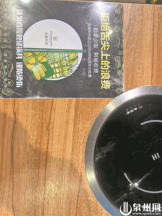 “店內(nèi)食材在用餐時間內(nèi)循環(huán)供應,我們溫馨提示您勤拿少取,厲行節(jié)約,從你我做起……”在豐澤區(qū)寶洲街的一家海鮮自助火鍋店,進店便可聽到正在播報的語音。店內(nèi)的自助吧臺上、墻上、桌上亦隨處可見厲行節(jié)約、反對浪費的宣傳標語。
