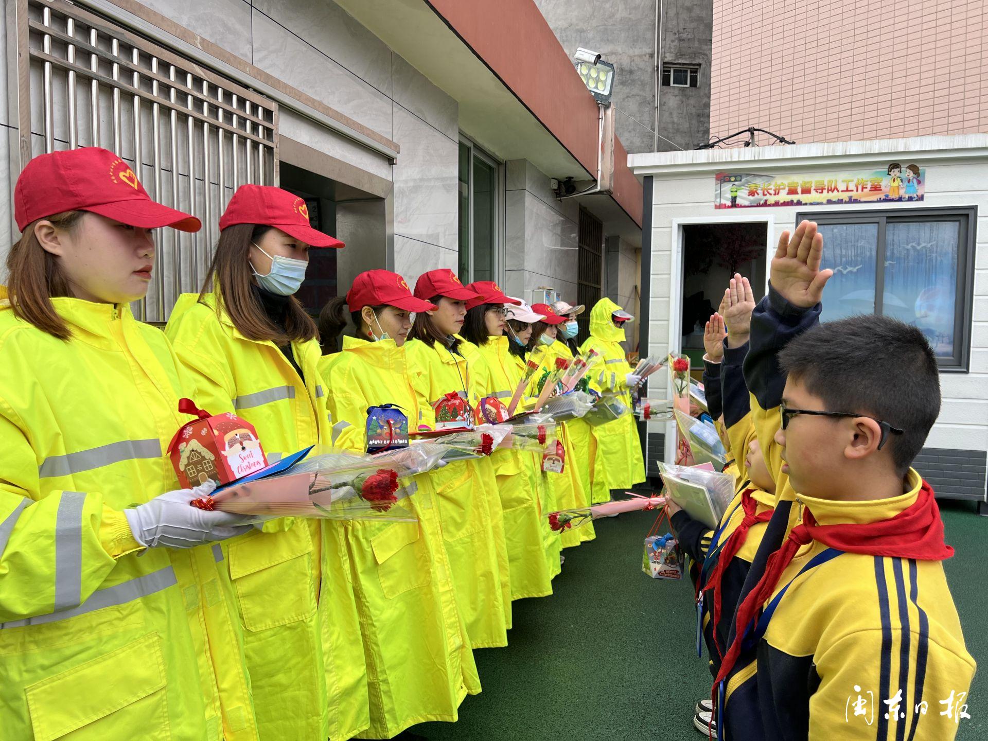 3月7日上午,放學(xué)鈴聲響起,蕉城區(qū)城南中心小學(xué)三年七班的孩子們排著隊,手握鮮花和賀卡來到校門口,為正在執(zhí)勤的護(hù)童隊家長們,送上“三八”婦女節(jié)的禮物。