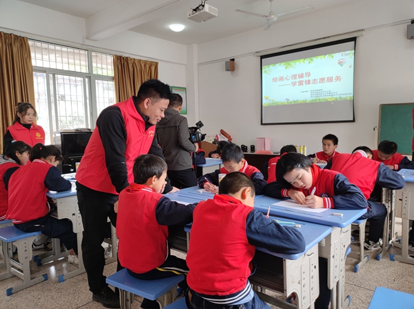 心理健康志愿者幫助留守兒童進(jìn)行繪畫心理分析