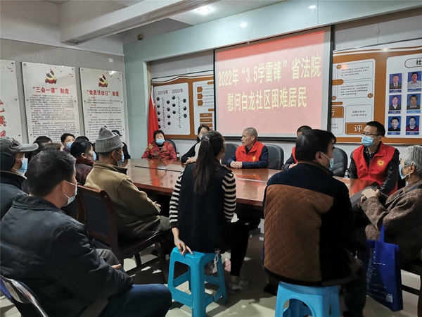 上午,省法院機(jī)關(guān)黨委副書記、紀(jì)委書記陳建成同志帶領(lǐng)志愿服務(wù)隊(duì)成員,到白龍社區(qū)以孤寡老人、空巢老人、殘障人士為重點(diǎn),開展扶困助殘活動(dòng),為他們送去慰問金。