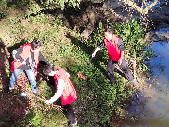 植樹現(xiàn)場(chǎng),志愿者們有的扶苗、有的埋土、有的踩實(shí)、有的澆水,現(xiàn)場(chǎng)一片熱火朝天的勞動(dòng)景象。經(jīng)過大家齊心協(xié)力,100多棵樟樹、桂花樹等樹苗挺立在村間地頭。植樹后,大家來到村口,認(rèn)真清理河道周邊垃圾雜物、河面漂浮物,經(jīng)過一個(gè)多小時(shí)的努力,河道面貌煥然一新、水清河暢。