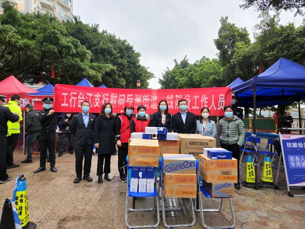 發(fā)動全區(qū)文明單位、愛心企業(yè)助力一線疫情防控工作。3月25日,牽頭組織工行臺江支行、農(nóng)行臺江支行、建行臺江支行等文明單位,神華置業(yè)公司等愛心企業(yè)分赴后洲、新港、上海、鰲峰等街道,為一線防疫人員送上價(jià)值8000余元的礦泉水、八寶粥、方便面、消毒液等物資。在全市集中核酸檢測工作期間,積極聯(lián)系轄區(qū)愛心餐飲企業(yè),組織MUA手工漢堡店、尚干餐飲公司、蘇寧廣場、華友匯創(chuàng)、信實(shí)家政等企業(yè)等為核酸檢測采樣點(diǎn)的工作人員捐贈餐點(diǎn)5000余份,福建巨聯(lián)環(huán)境科技有限公司向瀛洲街道捐資一萬元。