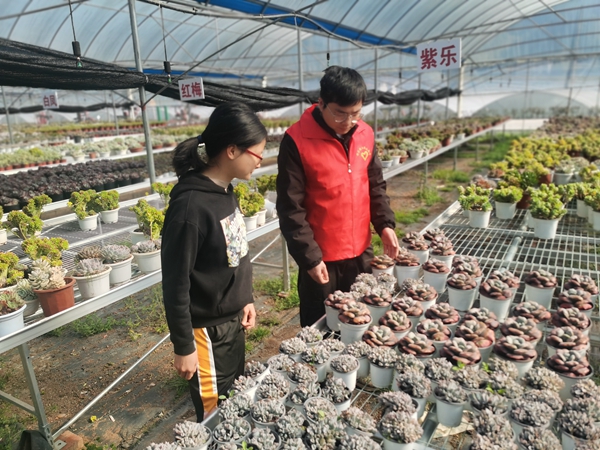 安樂(lè)鎮(zhèn)新時(shí)代文明實(shí)踐所志愿者對(duì)種植戶進(jìn)行多肉培育技術(shù)指導(dǎo)