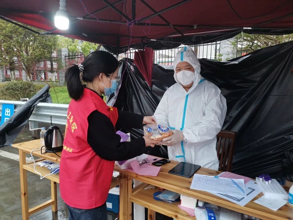 志愿者為醫(yī)護工作人員送上暖心餐食
