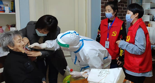 感恩福建組織志愿者分布在鼓山鎮(zhèn)5個核酸檢測采樣點(diǎn)開展抗疫志愿服務(wù),并與醫(yī)護(hù)人員入戶幫助行動不便的老人進(jìn)行核酸檢測。