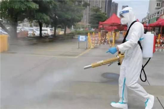 工作人員進行環(huán)境消殺工作。江南街道供圖