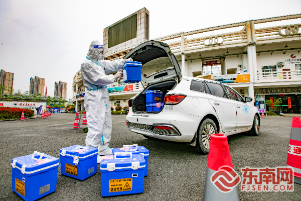 出租車司機把核酸檢測樣本運送到寧德核酸檢測方艙中心。鄭霄 攝