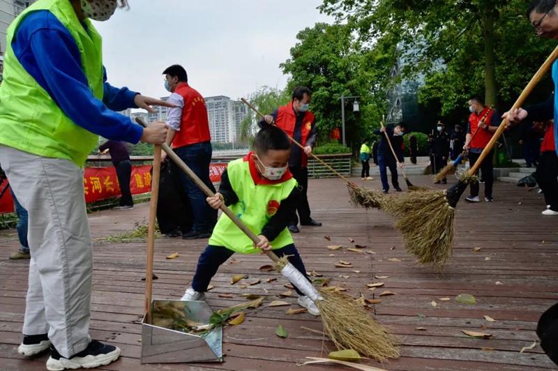 “河邊落葉比較多,我去拿一個(gè)垃圾袋來(lái)裝?!被顒?dòng)現(xiàn)場(chǎng),志愿者李華錕和6歲的兒子正在清掃落葉,兩人配合默契,不一會(huì)兒就裝滿了一個(gè)垃圾袋。李華錕說(shuō):“今天是周末,帶小孩來(lái)參加此次活動(dòng)既可以保護(hù)環(huán)境,也可以鍛煉小孩的動(dòng)手能力,感覺(jué)非常有意義?!笨粗鍜哌^(guò)后干凈整理的地面,母子倆不約而同露出了笑容。