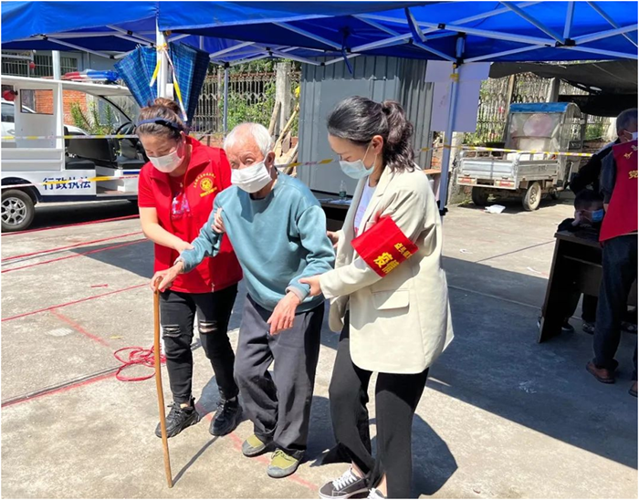 點(diǎn)頭鎮(zhèn)文昌社區(qū)新時(shí)代文明實(shí)踐站志愿者攙扶老人前往核酸檢測(cè)現(xiàn)場(chǎng)