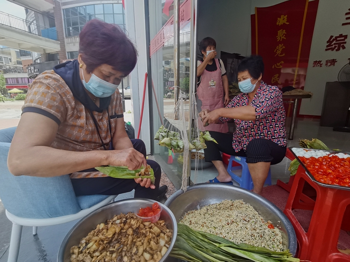 活動(dòng)現(xiàn)場(chǎng),志愿者們圍在桌旁,將粽葉卷成漏斗狀,然后填放糯米和食材,壓緊實(shí)、封好口、捆繩子,不一會(huì)兒,一串串香氣撲鼻的粽子便新鮮出爐,老人們圍坐在桌前其樂(lè)融融地吃著粽子,活動(dòng)現(xiàn)場(chǎng)溫馨祥和。