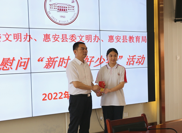 慰問組向新時代好少年茍曉敏送上慰問金。石獅市委文明辦 供圖