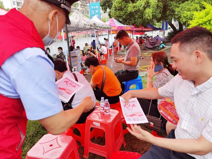 志愿者為休息處的考生家長(zhǎng)分發(fā)宣傳手冊(cè),緩解緊張情緒(華安縣人民法院 供圖)