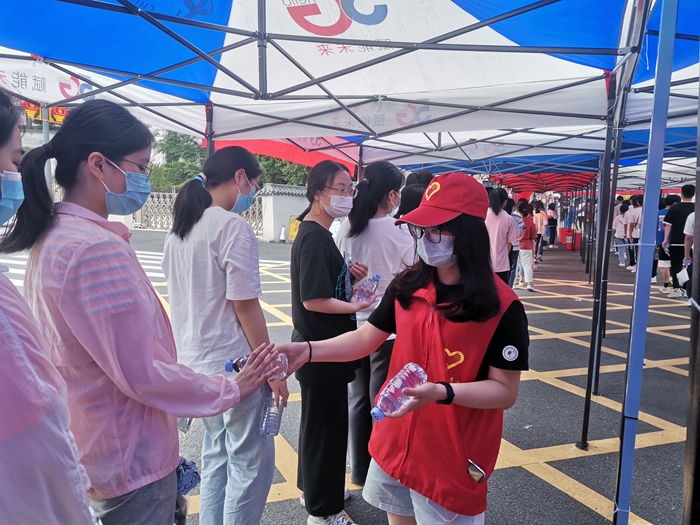 志愿者免費(fèi)為考生送上礦泉水、防暑物品(縣直機(jī)關(guān)工委供圖)