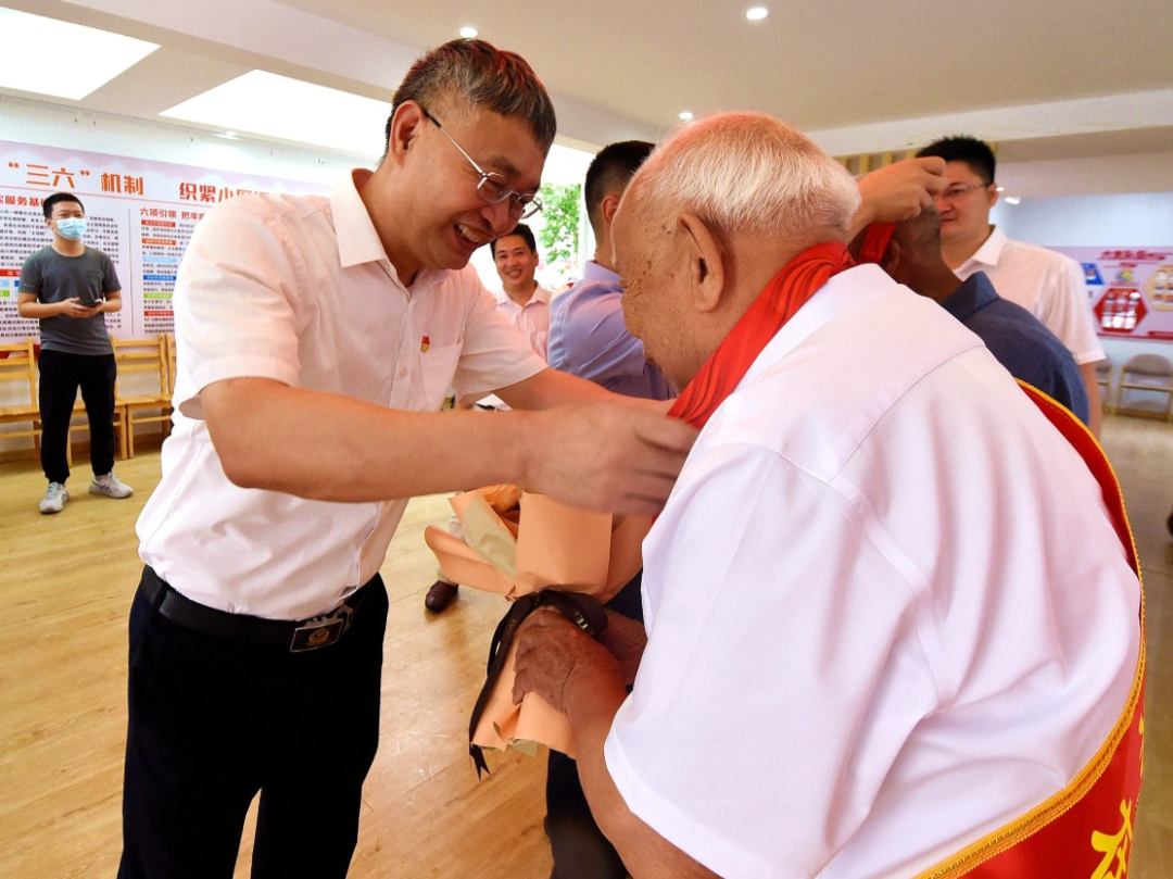 在金溪社區(qū),何必良與有著50年以上黨齡的梁樹炎、鐘清宋兩位老同志親切交談,關切詢問他們的生活和身體情況,共同回顧黨的光輝歷程,并為他們頒發(fā)佩戴“光榮在黨50年”紀念章。