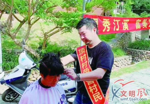 文明風(fēng)7月8日訊(通訊員 黃文水 余雪燕 林文足)昨日,在廈門同安五顯鎮(zhèn)西洋村的一棟古厝里,穿著紅馬甲的三名理發(fā)師一絲不茍地為老人們理發(fā),理完頭發(fā)的老人興高采烈出門去,招呼其他老人也過來理發(fā)。這是同安典塑美發(fā)店進(jìn)鄉(xiāng)村義剪的一幕。