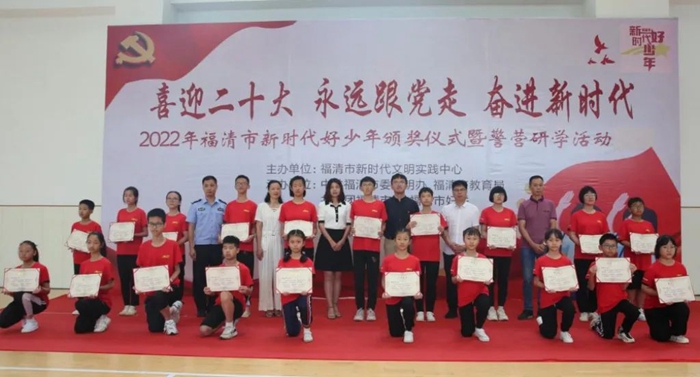 福清市委文明辦、教育局、團(tuán)市委、婦聯(lián)、關(guān)工委、巡特警相關(guān)領(lǐng)導(dǎo)為2022年福清市新時代好少年頒發(fā)證書。 馮錦攝
