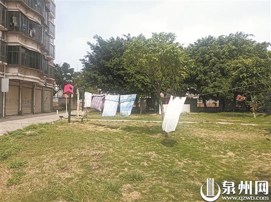 小區(qū)中庭水池已被棄用,有居民在水池假山上曬被褥,底下的水泥地面也曬有幾堆花生。照暉樓附近的綠地和健身路徑,同樣晾曬著許多衣物和被子。