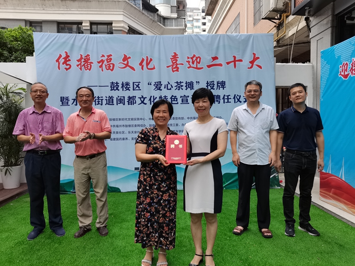 文明風7月30日訊 為迎接黨的第二十次全國代表大會勝利召開,深入挖掘“?!蔽幕Y源,傳播閩都文化,營造濃厚“?!蔽幕諊Y(jié)合“愛心茶攤”宣傳活動,7月28日上午,由鼓樓區(qū)新時代文明實踐中心、中共福州市鼓樓區(qū)委宣傳部、中共福州市鼓樓區(qū)委文明辦、中共福州市鼓樓區(qū)委網(wǎng)信辦、鼓樓區(qū)水部街道黨工委、辦事處、水部街道新時代文明實踐所主辦,樂天泉社區(qū)、樂天泉社區(qū)新時代文明實踐站、閩都鄉(xiāng)學研究會承辦的“傳播‘?!幕?喜迎二十大——鼓樓區(qū)‘愛心茶攤’授牌暨水部街道閩都文化特色宣講團聘任儀式”在鼓樓區(qū)水部街道樂天泉社區(qū)長者食堂門口休閑廣場上舉行。