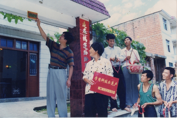 1997年,將樂縣高唐鎮(zhèn)??诖鍎?chuàng)評(píng)領(lǐng)導(dǎo)小組為“學(xué)用科技示范戶”掛牌。