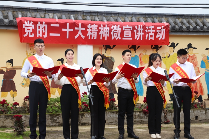 “作為浦城縣新時代微宣講員,今天非常地榮幸能夠?qū)Ⅻh的二十大精神送入基層,讓‘聚是一團火、散是滿天星’的二十大精神進入千家萬戶。黨的二十大報告振奮人心、催人奮進,為大家的團結(jié)奮斗指明了方向、路徑,今后會再接再厲,為大家?guī)砀泳实男v?!?微宣講員謝慧文說。