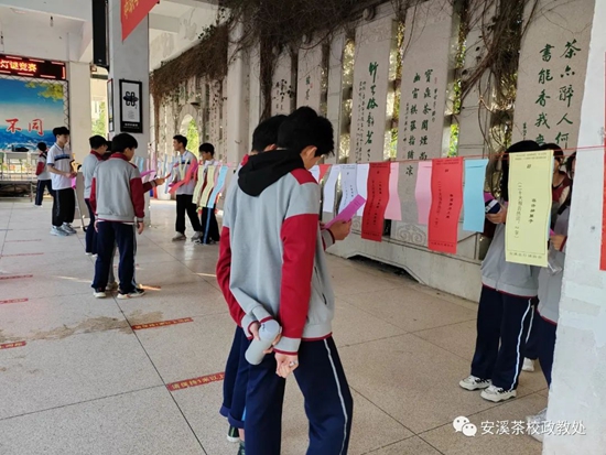 競猜活動現(xiàn)場,一張張寫著謎面、五顏六色的條幅高高懸掛,內(nèi)容包括“黨的二十大報告熱詞”“安溪縣市民文明公約”“社會主義核心價值觀”“團隊建設(shè)”等,條幅前,師生們興高采烈有序參與競猜,現(xiàn)場氣氛活躍熱烈。