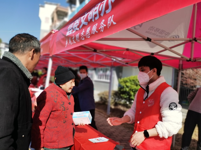 鄉(xiāng)風(fēng)文明志愿者向群眾普及移風(fēng)易俗知識(shí)