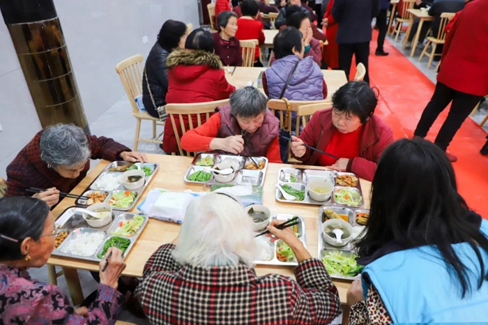 老人們?nèi)宄扇海瑖诓妥琅?,邊嘮家常邊吃著熱乎菜