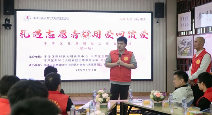 文明風(fēng)3月20日訊 為弘揚(yáng)奉獻(xiàn)、友愛、互助、進(jìn)步的志愿服務(wù)精神,貫徹落實(shí)《福建省志愿服務(wù)條例》,推動(dòng)市民文明素質(zhì)養(yǎng)成,健全完善志愿服務(wù)保障激勵(lì)機(jī)制,倡導(dǎo)“人人志愿、隨手志愿”的社會(huì)文明風(fēng)尚,促進(jìn)豐澤區(qū)志愿服務(wù)事業(yè)制度化、規(guī)范化發(fā)展,3月18日下午,在豐澤區(qū)新時(shí)代文明實(shí)踐中心開展“禮遇志愿者?用愛回饋愛”——豐澤區(qū)禮遇饋愛志愿者活動(dòng),共計(jì)30多名志愿者參與。